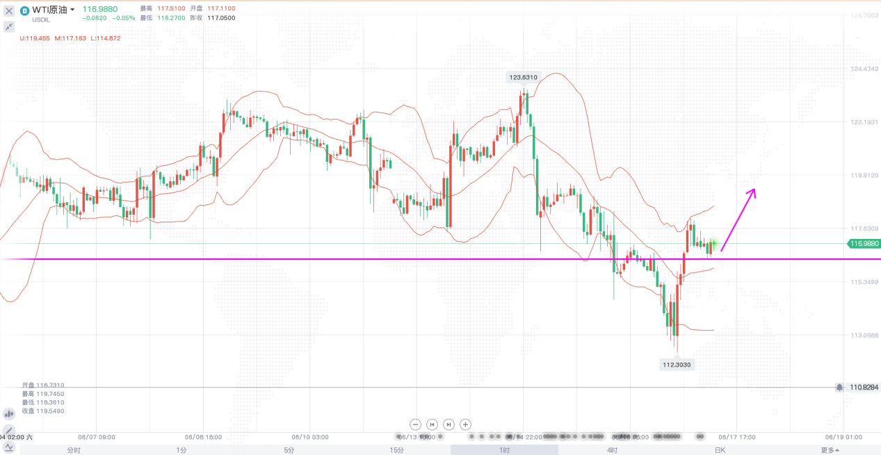 原油本周价格冲高未果,连续两日走了回落,但大的方向并没有受到影响,从市场的长远供需关系来看,未来价格还有很大的上升空间。日线级别,布林带收口,价格自上轨附近开始回撤,昨日一波探底回升行情使得价格短暂跌破中轨支撑,不过收盘还是重新站回中轨上方,形成下影线较长的阳线,说明下方支撑力量较为强劲。4小时,布林带开口向下,价格在触及到112.3一线后企稳反弹,日内价格有随时上破中轨一线的可能,一旦破位,价格便有望继续走高,日内操作思路回调做多,下方关注115.5一线支撑。
