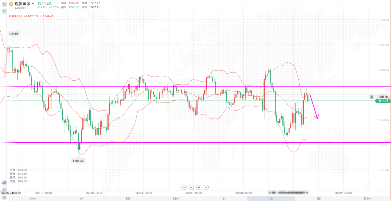 黄金整体来说,低位震荡的格局并没有改变,价格自5月份下行探底以来,基本处于横盘整理的状态,没有一个明确的方向,市场面消息频发,一方面高通胀引起的避险情绪浓厚,另一方面,强烈的加息预期使得黄金承压,短期来看,价格很难走出震荡区间。日线级别,布林带走平,价格横盘于上轨和下轨之间,早间开盘快速回落,日内走势震荡偏空。4小时,布林带开口,价格反弹至上轨附近遇阻,并未突破1860一线阻力,日内操作思路以1860阻力为防守,反弹做空即可。