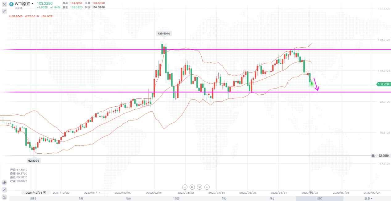 整体来看,原油价格回测100美元关口势在必行了,整个市场的利空因素不断,加之多头的获利了结,短线油价再度冲高有点难度。日线级别,布林带开口向下,价格跌破下轨一线支撑,走势震荡偏空,早间开盘延续昨日下跌,日内有望试探100美元关口。4小时,布林带开口向下,价格成震荡下行态势,价格反弹力度不大,日内操作思路明确反弹做空即可,上方关注105.5一线阻力。