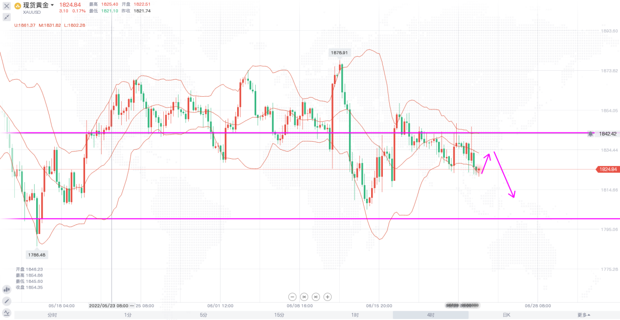黄金本周走势比较平淡,价格始终维持在1850下方震荡,日线级别,布林带开口向下,自上周五跌破布林中轨以来,连续几日受到中轨的压制,价格多次向上反弹,均未能突破,整体走势保持震荡下行态势,并且低点不断下移。4小时,布林带开口向下,价格呈震荡下行态势,连续两日在1820附近受到支撑反弹,短线走势比较焦灼,方向不是很明确,日内操作思路上暂时还是以反弹高空为主,上方关注1833一线阻力。