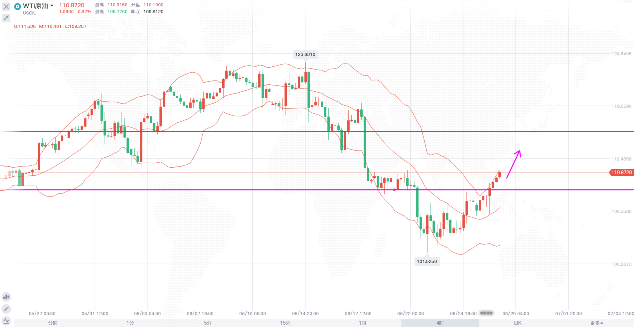 原油价格的再度崛起已然势在必行,之前也一直在说,消息面的影响只是暂时的,整个市场供不应求的局面改善不了,原油长期还是要涨上来的。日线级别,布林带收口,价格自下轨附近企稳反弹,连续两日的反弹使得油价站上了前期的阻力平台,下一个目标就是布林中轨一线的阻力,也就是115美元一线。4小时,布林带开口向上,价格沿着上轨震荡上行,基本没有太多的回调,短线走势震荡偏多,日内操作思路明确,回调做多即可,下方关注110美元一线支撑。