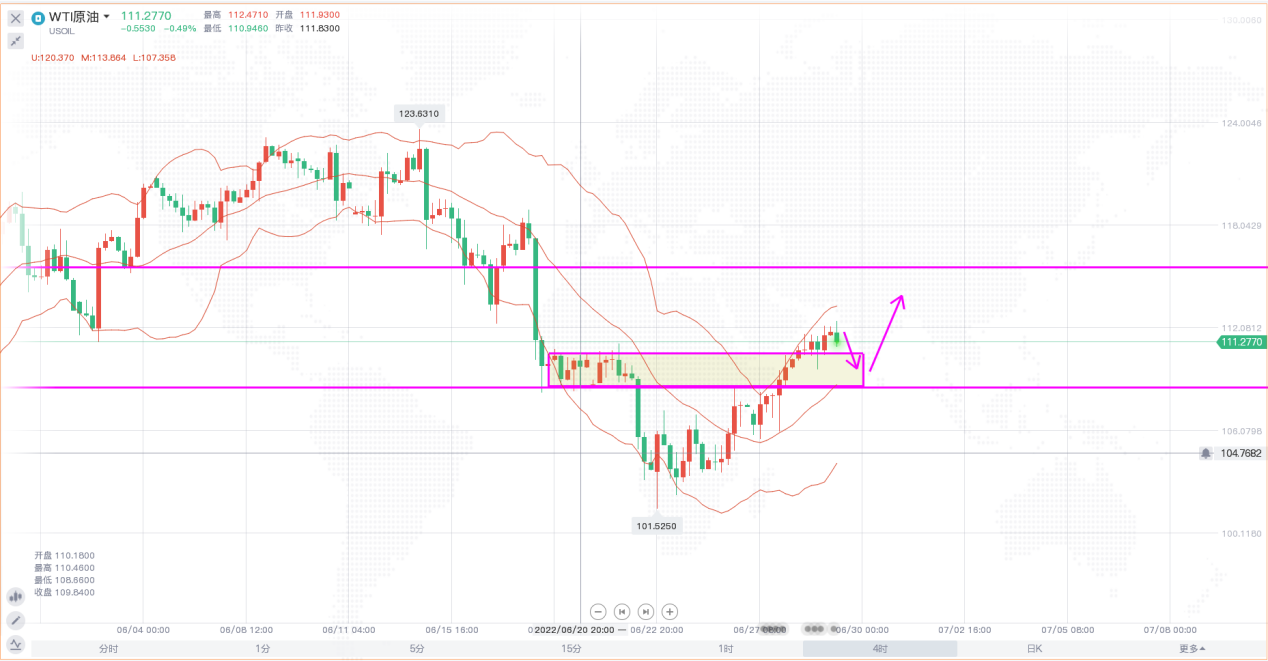 原油中长期的上涨局面毋庸置疑,价格在本次回调之后也是迎来了像样的反弹,价格最终是要回到高位的。日线级别,布林带收口,价格自下轨附近开始反弹,一步一步接近中轨附近,早间开盘价格小幅回落,价格需要回调整理然后再度上行。4小时,布林带开口向上,价格站上前期阻力平台,阻力变支撑,日内价格有回调需求,需关注下方110.5-109.5区域的支撑情况,操作思路上回调做多即可。
