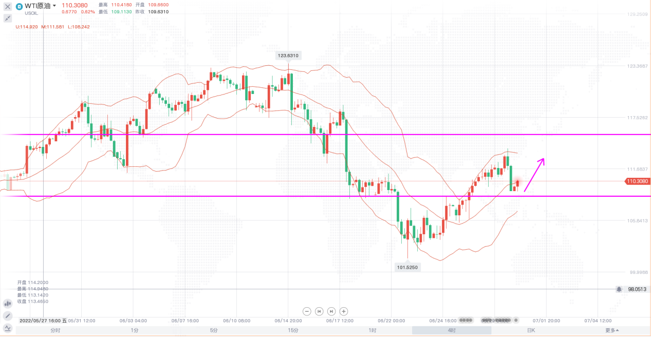 原油价格整体方向比较明确,昨日美盘的下跌大部分也是受到EIA数据的影响,但这并不能改变价格的整体走势。日线级别,布林带收口走平,价格暂时在中轨附近遇阻回落,形成横盘整理态势,早间开盘价格小幅反弹,有企稳迹象,日内有望继续走高。4小时,价格自上轨附近回撤,但并未下破前期的顶底转换位置,日内操作思路以此位置为防守,继续看涨,下方关注109美元一线支撑。