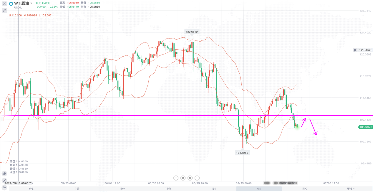 原油价格目前处于高位震荡的状态,日线级别,布林带开口向下,价格在上周触底反弹,但上方布林中轨对价格形成压制,在触及到中轨遇阻后持续回落,未能突破中轨附近的阻力,那么价格就有再次去试探100美元关口的可能。4小时,布林带开口,价格跌破下轨一线支撑,于昨日低点附近横盘,反弹力度较小,短线有望继续走低,日内操作思路建议反弹做空,上方关注108美元一线阻力。