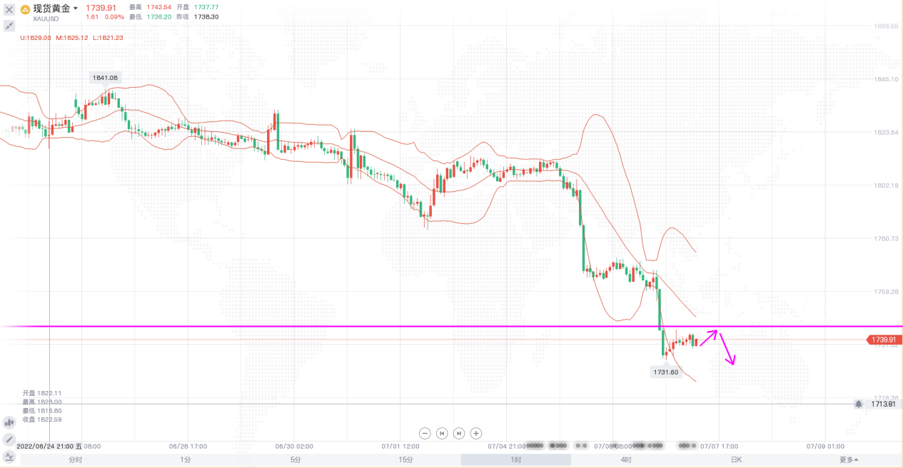 黄金价格连续两日下跌打开了下行的通道,在整个下跌过程中没有太多的反弹,昨日美盘直接下破1750一线关键支撑,弱势格局显而易见,下一个目标就是1720附近。日线级别,布林带开口向下,价格一度跌破下轨一线支撑,在美元强势上涨的局面中,短线很难有像样的反弹,日内大概率延续下跌走势。4小时,布林带开口向下,价格沿着下轨快速下行,整体走势偏弱,日内操作思路继续看空,上方关注1745-1750一线阻力。