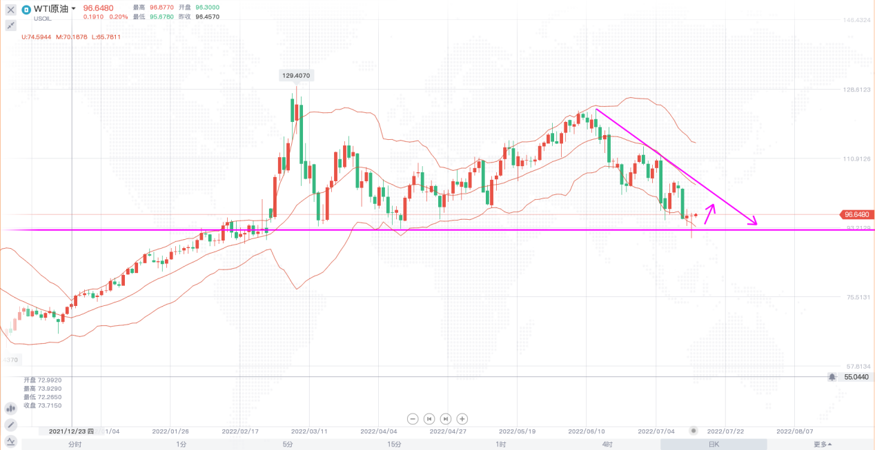 原油近期走势不是很明朗,价格在大幅回调之后,处于一个关键支撑位置,昨日的下破也只是虚晃一枪,最终收得下影线较长的阳线,说明下方支撑强劲。日线级别,布林带开口向下,价格位于下轨附近震荡,短线来看,这个位置有效下破有点难度,行情大概率会在这个位置附近三角收敛,然后在选择方向突破,日内开盘价格延续昨日涨势,短线有望继续反弹。4小时,布林带收口,价格目前受到中轨压制横盘震荡,日内需关注中轨附近的突破情况,如果能够上破,价格就有机会再度回到100美元附近,日内操作思路暂时还是以回调做多为主,下方关注94-93.5一线支撑。