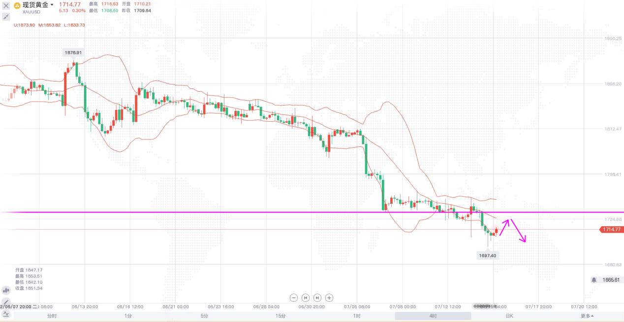 黄金目前而言弱势格局已经很明显,日线级别布林带开口向下,价格沿着下轨震荡下行,昨日美盘价格短暂下破1700关口,虽说暂时反弹重回1700上方,但反弹力度有限,美元的强势走势使得目前黄金价格很难走出大的反弹行情。4小时,布林带开口向下,价格受到中轨压制震荡下行,目前在下轨附近企稳,有反弹迹象,短线整体走势震荡偏空,日内大概率会是小幅反弹之后再度试探1700一线,操作思路上保持反弹高空的思路,上方关注1730一线阻力。
