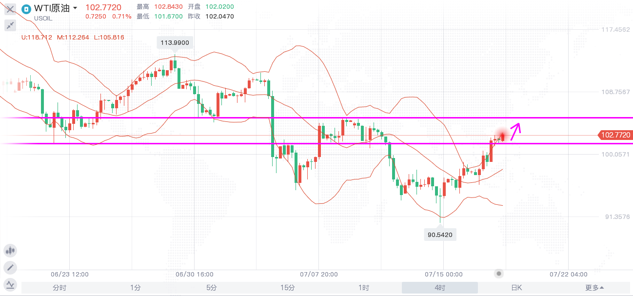 伊核协议的谈判已经持续数月,但未能取得重大进展,再度陷入僵局,这削弱美取消对伊朗的制裁,并降低了伊朗向市场供应原油的希望,给油价带来强劲支撑。总体来看,原油价格受益于美元疲软,欧洲能源危机为多头助力,重回100关口上方;中东地缘局势紧张,以及在美方中东之行后,俄也将访问中东,多重利多影响下,油价短线有一定上涨动力。