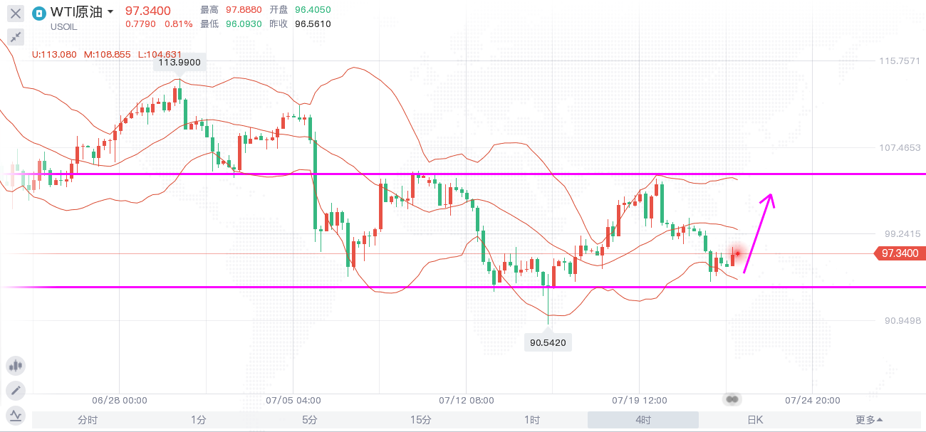 原油日线级别价格受到中轨压制后再度下行,再一次试探94.5美元一线支撑,之前也说过,这个位置支撑强劲,而上周四的下破也只是一次虚破,价格很快重回支撑上方,昨日的下跌并没有跌破这一线,价格暂时企稳,那么日内就有反弹的希望。4小时,布林带开口向下,价格横盘于下轨附近,短线价格下破有难度,大概率会是低位震荡之后再度上行,日内操作思路上回调做多即可,下方关注94.5一线支撑。
