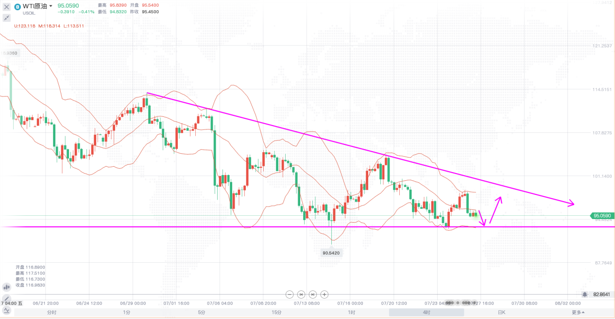 原油价格近期走势比较纠结,方向上并不是很明朗,价格在前期重要的支撑位置上方横盘震荡,多次试探,并没有下破的迹象,同时也没有走出像样的反弹,始终以来回震荡为主。日线级别,布林带开口向下,价格运行于中轨和下轨之间,保持低位的横盘震荡,早间开盘价格延续昨日跌势,但力度不大,预期晚间数据公布之前行情波动不会太大。4小时,布林带走平,价格跌破中轨支撑,暂时受阻于中轨的压制,整体处于三角收敛区间,有走低的风险,日内需重点关注下方93.5一线支撑,回踩不破,则价格就有反弹的机会。