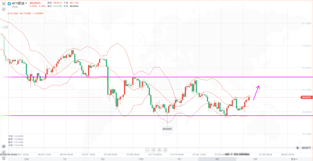 原油价格早间看盘延续昨日的涨势,日线级别,布林带有收口迹象,价格再度向布林中轨一线发起冲击,日内的关注点也在于此,一旦破位,价格将会重新站上100美元关口。4小时,布林带开口向上,价格自中轨附近持续上涨,有打开上轨继续上涨的趋势,短线走势震荡偏多,日内操作思路回调做多即可,下方关注97.5一线支撑。