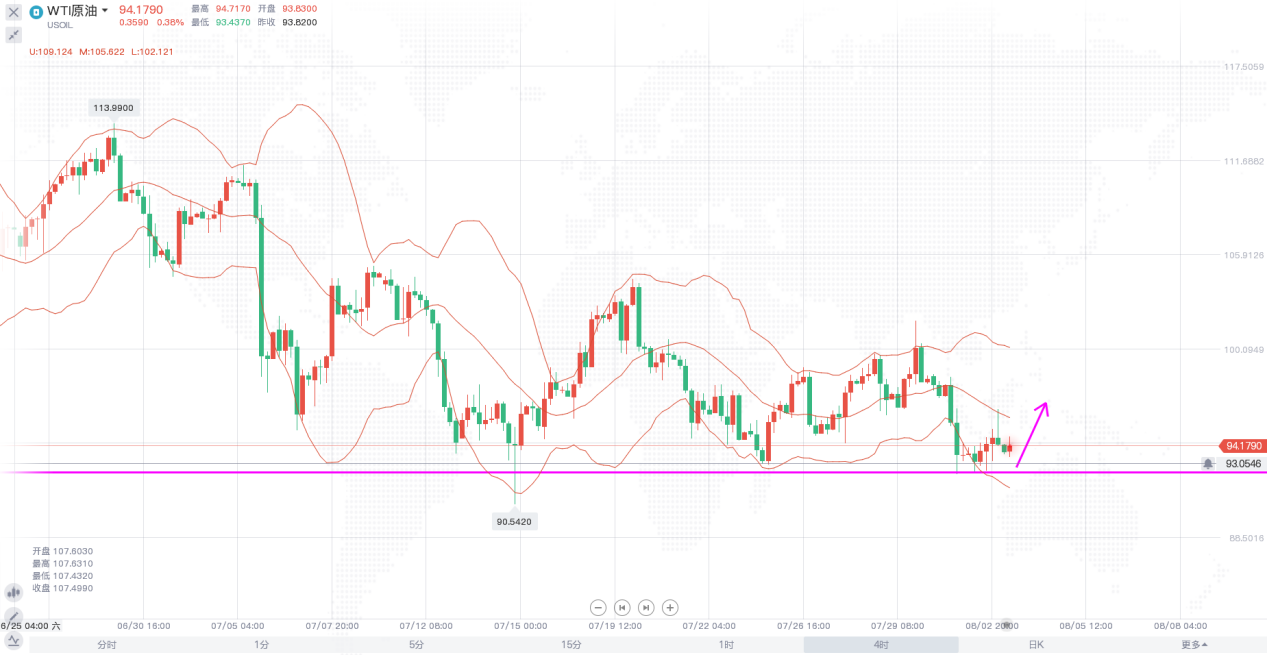 原油价格近期的走势基本没有太大变化,维持在90美元关口上方横盘震荡,日线级别,布林带开口,价格运行于中轨和下轨之间,上周五价格强势反弹一波,短暂突破中轨一线压制,但很快重回中轨下方,周一价格直接再度探底,这也是一直所强调的,原油价格想要有大的反弹空间,就必须要突破布林中轨这一重要阻力,昨日价格在低位收十字星,日内开盘价格小幅反弹,有进一步走高的迹象。4小时,布林带开口向下,价格横盘于中轨和下轨之间,下方92.5一线支撑强劲,短线下破有难度,日内大概率会先走一波反弹,然后等待晚间的数据,日内操作思路上以92.5一线支撑为防守,先看一波反弹。