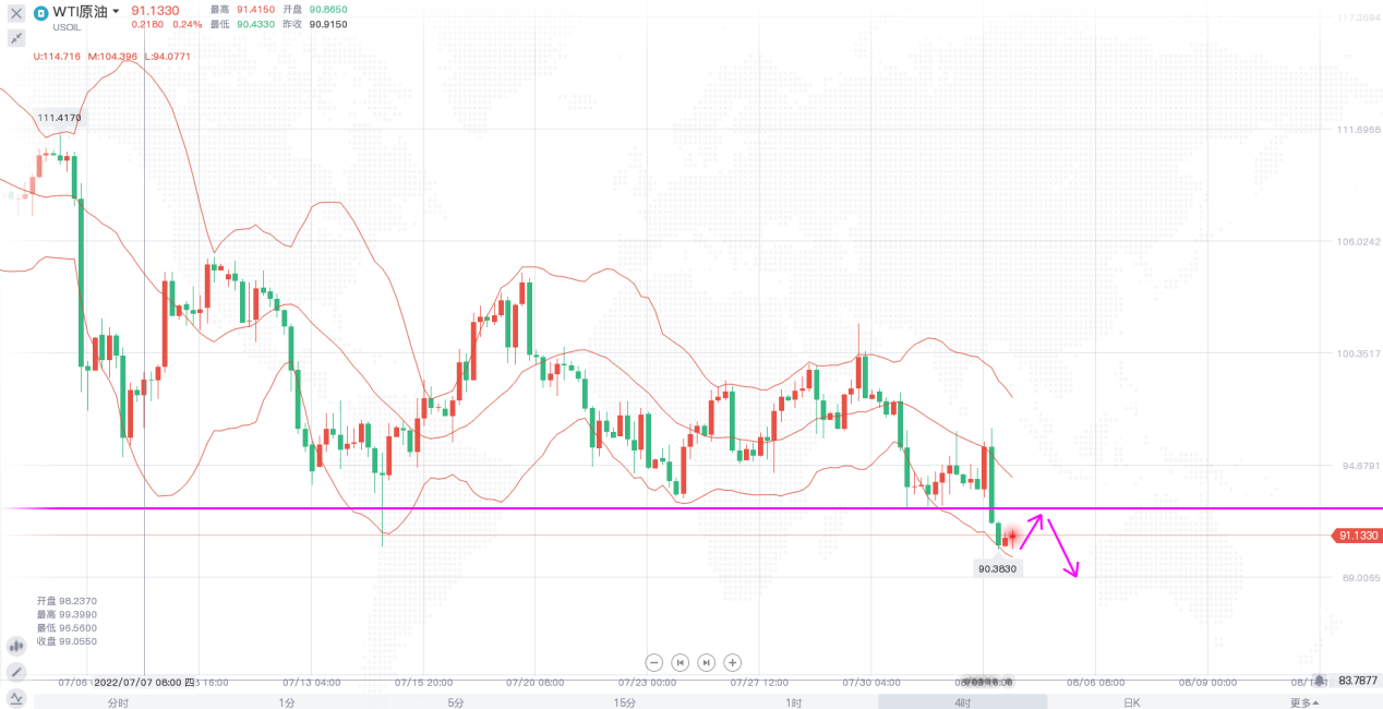 原油价格近段时间的横盘震荡在昨日向下得到了破位,日线级别,布林带开口向下,价格在经历多次向上试探,都未能突破布林中轨一线的阻力,而昨日的下跌使得价格收盘在重要支撑下方,短线走势震荡偏空。4小时,布林带开口向下,价格在触及中轨一线后快速下跌破位,空头实力较为强劲,支撑变阻力,日内操作思路上以92.5一线为防守,反弹做空即可。