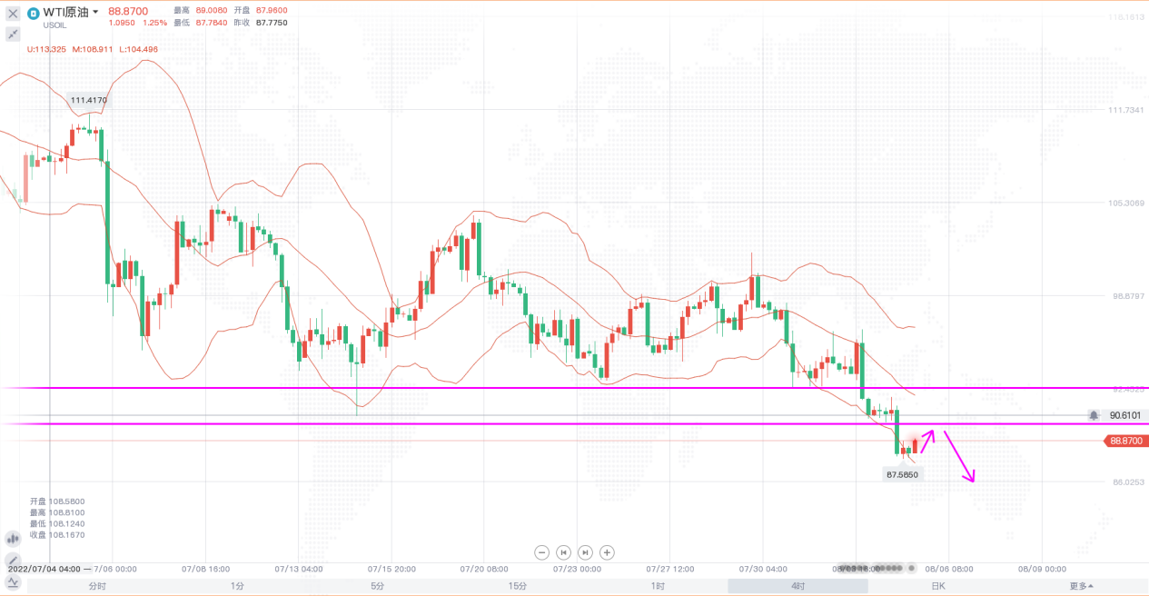 原油价格近期的弱势走势相对明显一点,自价格跌破92.5一线重要支撑之后,价格反弹的难度再度增加。日线级别,布林带开口向下,价格昨日延续下跌,一举跌破布林下轨一线支撑,短线走势震荡偏空,目前原油市场需求疲弱的忧虑为影响市场心态的主要因素,所以价格再度下行的风险加大。4小时,布林带开口向下,价格横盘之后向下突破,虽然目前价格在88美元上方企稳,但反弹力度不大,日内价格大概率小幅反弹一波之后再度下行,操作思路上以反弹高空为主,上方关注89.5-90一线阻力。
