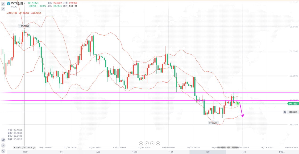 原油价格近期保持低位震荡,虽然昨日价格向上冲高一波,但反弹力度有限,并未走出很好的反弹行情,整体走势还是震荡偏弱。日线级别,布林带开口向下,价格运行于中轨和下轨之间,价格的反弹未能突破前期顶底转换的位置,上方阻力强劲,加上近期伊朗原油有望重回市场,价格下行风险较大。4小时,布林带收口,上方91.5一线水平阻力强劲,即便昨日盘中上破,但很快又重回此位置下方,日内操作上以此位置为防守反弹做空即可。