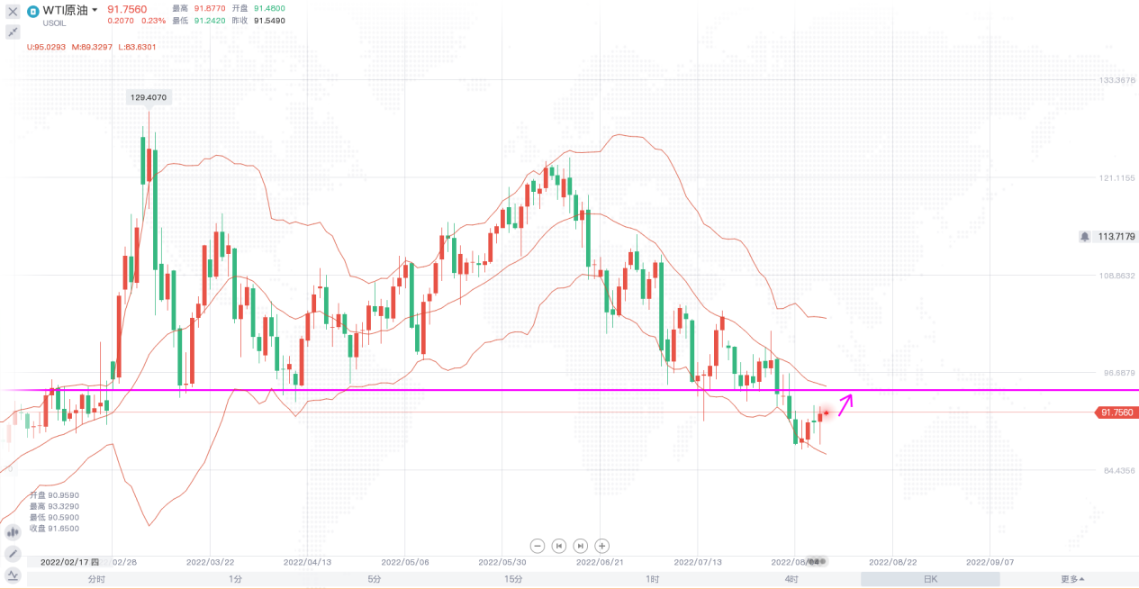 原油价格近期保持低位震荡的走势,价格触底87美元一线之后,多次向下试探,均未能下破,下方支撑强劲。日线级别,布林带开口,价格多次受到下轨附近支撑,形成低位横盘整理走势,而昨日的探底回升使得价格有了进一步上涨的势头,早间开盘价格延续昨日上涨,短线有试探布林中轨一线可能。4小时,布林带开口向上,价格连续阳线震荡上行,日内有打开上轨走高的趋势,而日内需要关注的是上方92.5一线阻力的破位情况,一旦上破,价格大概率会冲击94.5一线,日内操作思路上回调做多即可,下方关注91-91.5附近支撑。