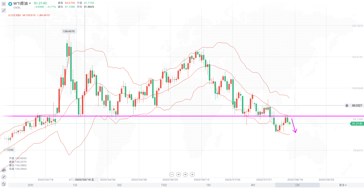 原油价格短线来说触底迎来了一波反弹,但反弹力度有限,日线级别来看,布林带开口向下,价格在触及到布林中轨这一重要阻力之后,再度选择向下回撤,价格短线缺乏向上破位的动力,早间开盘,价格延续上周五的跌势,日内有继续有低的风险。4小时,布林带收口走平,价格自上轨附近遇阻持续下跌,连续阴线的走势跌破中轨一线支撑,目前还未有企稳的迹象,日内操作思路上以反弹高空为主,上方关注92-92.5区域阻力。