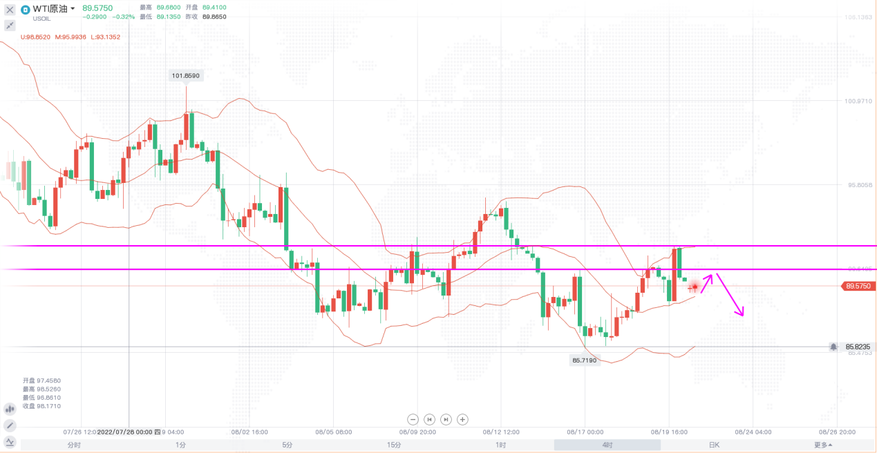 此前由于7月美非农就业数据亮眼,CPI和PPI略微好转,使得市场一度乐观情绪抬升,开始预期美联储即将放慢加息步伐,甚至预期收紧政策因此发生逆转。随即美债收益率上升,美元指数走强,降低了黄金的吸引力,市场参与者开始积极抛售黄金。到目前为止,由于美元需求显著,黄金价格仍面临进一步下行风险。在经济衰退担忧加剧之际,规避风险的市场状况推动下,美元继续在复苏反弹的基础上走高。在没有任何重要的美经济事件发生的情况下,美联储预期的重新定价和周末资金流将在金价走势中发挥关键作用。本周还将迎来杰克逊霍尔央行年会,美联储主席鲍威尔也将发表讲话,预计鲍威尔将强化进一步加息预期,可能会对金价不利。