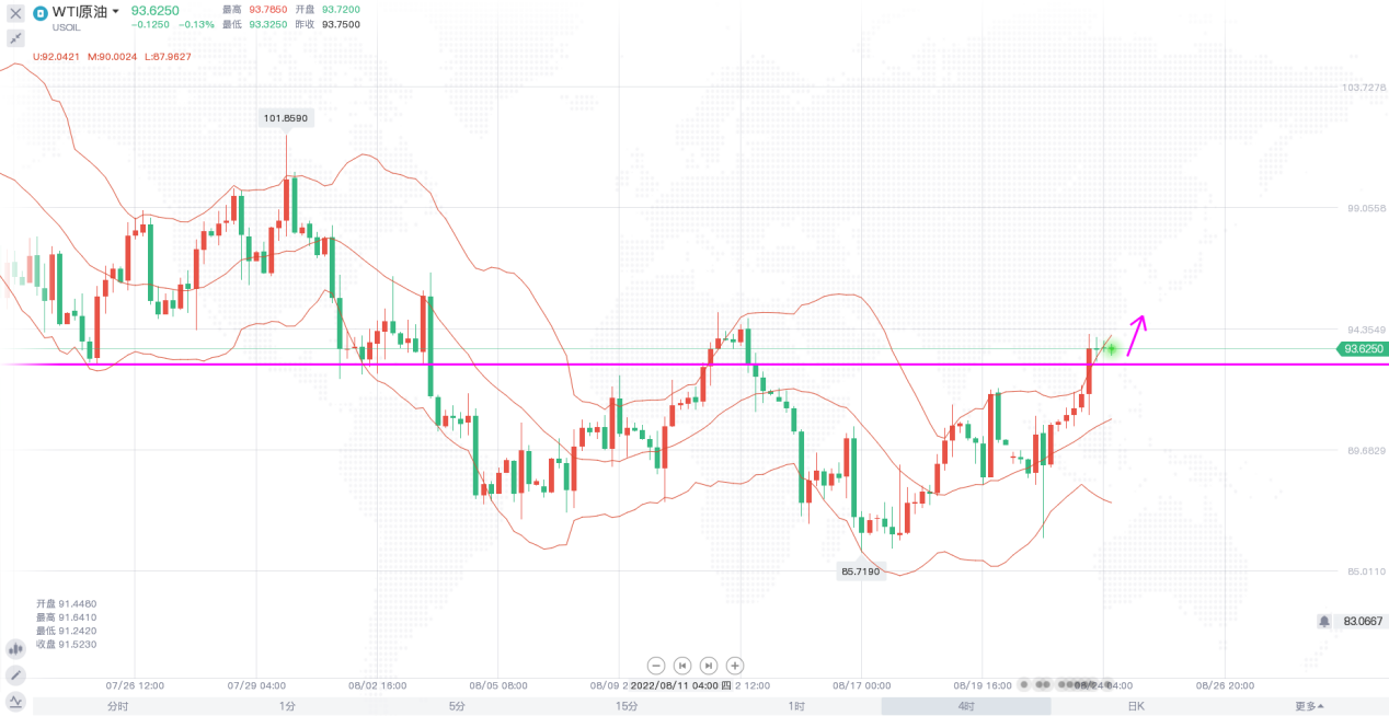 原油价格昨日受到基本面的影响,大幅上涨逾4%,连续两日的反弹使得价格打破了前期震荡下行的局面。日线级别,布林带收口,价格自下轨受到支撑后,连续走高,昨日更是突破了布林中轨一线的重要阻力,短线呈现出持续反弹的迹象,早间公布的API数据更是利多,如果晚间EIA显示库存进一步下降,油价短线则有机会试探95.5附近阻力。4小时,布林带开口向上,短线价格走势震荡偏多,预期日内价格小幅回调后会延续昨日上涨趋势,日内操作思路上以回调做多为主,下方关注93-92.5区域支撑。