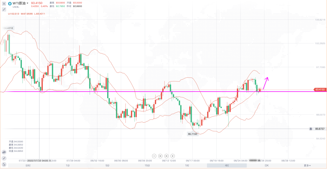 原油价格本周持续反弹,价格在反弹的过程中也突破了重要的阻力位置,这意味着前段时间震荡下行的走势得以扭转。日线级别,布林带收口,连续三根阳线突破了布林中轨一线阻力,短线走势震荡偏多,虽然昨日价格有所回落,但还是运行于中轨和上轨之间,早间开盘价格小幅上涨,且有继续走高的趋势。4小时,布林带收口,价格暂时横盘于中轨93没美元附近,可以看到周三之后价格走了一波回撤,但并未下破92.5一线支撑,日内可以以此为防守,先看一波上涨,重点关注晚间消息面的影响。