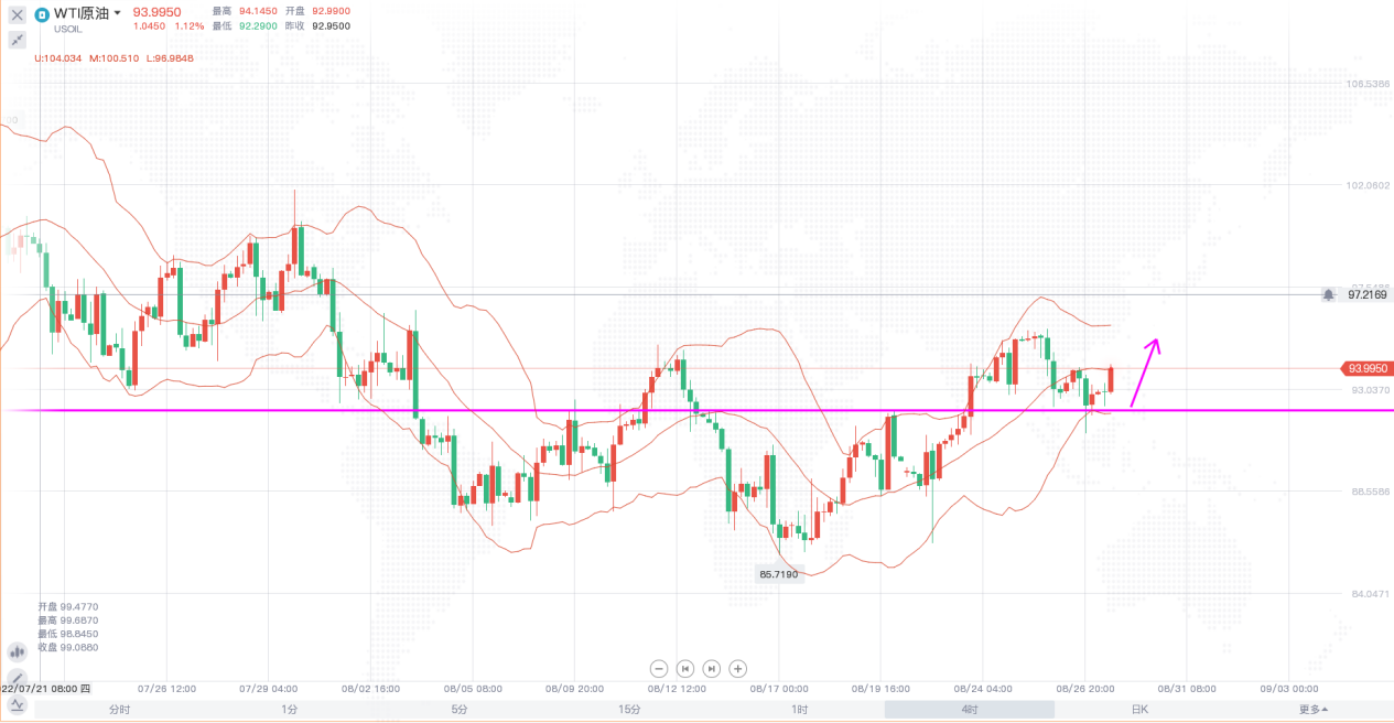 原油价格近期走势整体维持震荡,价格在上周向上破位之后预示着短线价格走势已经得到扭转,而基本面频出的利多消息使得油价很难再有大的跌幅。日线级别,布林带收口走平,价格触底之后形成震荡上行态势,上周五价格回踩中轨支撑后再度上行,整体走势震荡骗多多。4小时,布林带走平,在下轨附近受到支撑,也就是92美元附近,即便上周有过下破,也不过是虚破而已,价格很快收复跌幅,日内走势还是以震荡上行为主,短线关注下方92.5附近支撑,操作上以回调做多为主。