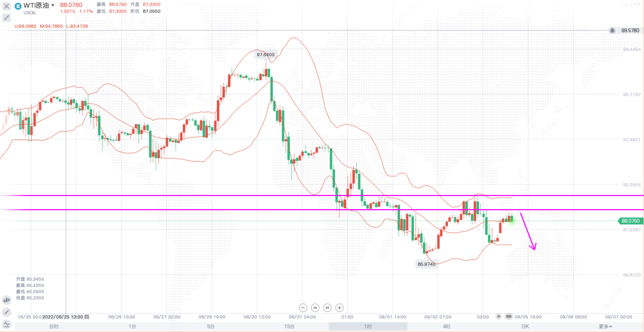 原油价格近期走势依旧保持低位震荡局面,虽然前几日有所反弹,但很快回吐涨幅,整体走势并不是很明朗。日线级别,布林带走平,价格自上轨附近连续三连跌回撤至下轨,短线走势偏弱,不过价格临近震荡区间下限,支撑也较为强劲,下破有点难度,更多的是小幅反弹震荡再度试探,日内需关注上方布林中轨90.5附近阻力。4小时,价格在布林中轨附近遇阻回撤,价格运行于中轨和下轨之间,短线并未表现出太强的反弹迹象,只要价格没上破中轨一线阻力,就很难走出像样的反弹,日内操作上高空为主,上方关注88.7-90.5区域阻力。