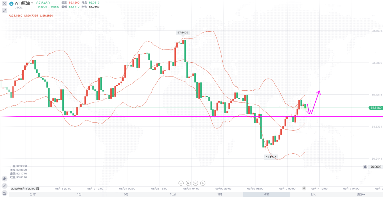 原油价格近期探底回升,日线级别价格走出了三连阳的格局,目前来看,日线布林带走平,价格在周一试探了中轨一线的阻力,价格未能上破,但回调力度不大,价格小幅回调之后有再度冲击中轨阻力的可能。4小时,布林带开口向上,价格短暂突破上轨阻力后横盘整理,短线走势震荡偏多,日内需关注下方86.5附近支撑,前期价格多次回踩此位置后形成反弹,日内价格大概率会回踩之后再度上行,短线操作思路上尽量以回调做多为主。