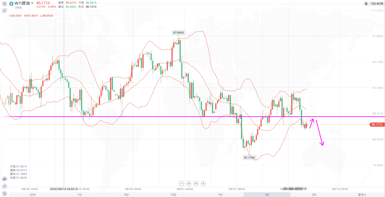 原油价格日线级别布林带开口向下,整体走势从123美元附近开始下跌以来,大的方向一直保持着震荡下行的走势,虽然中间有过几次反弹,但很快价格又重回下跌趋势之中,而一直强调的布林中轨则是价格反弹的一大难关,昨日价格的下跌也是在触及到中轨遇阻后启动的,所以价格的反弹在没有站上中轨之前,大的方向不会改变。4小时,布林带开口向下,价格快速跌破中轨支撑,在下轨附近横盘整理,短线走势偏弱,预期日内小幅反弹之后会再度延续跌势,有再度试探82美元一线可能,日内操作上以反弹高空为主,上方关注86.2附近阻力。