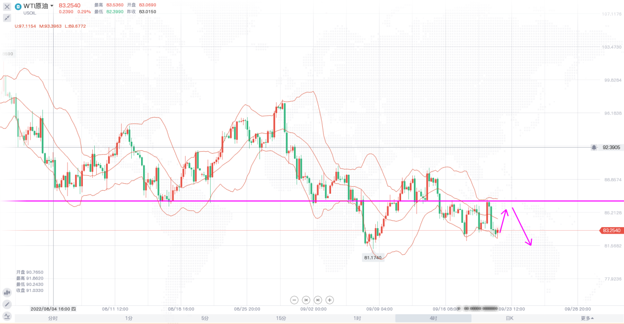 黄金价格昨日表现相对平静,在利率决议重磅消息的刺激下,价格并没有走出低位的震荡区间,消息公布后,价格短暂刺破1680,但又很快回吐涨幅,重回震荡区间。日线级别,布林带开口向下,价格依托下轨横盘震荡,整体走势震荡偏空,从技术层面来说,价格只要没站上1680一线,大的方向还是以空为主。4小时,布林带有开口迹象,早间开盘价格持续下跌,有跌穿下轨的迹象,经历了昨晚的冲高回落,可以很明显的看出价格走势还是比较弱的,向下随时有跌破1650一线支撑的可能,日内操作上以反弹高空为主,上方关注1667附近阻力。