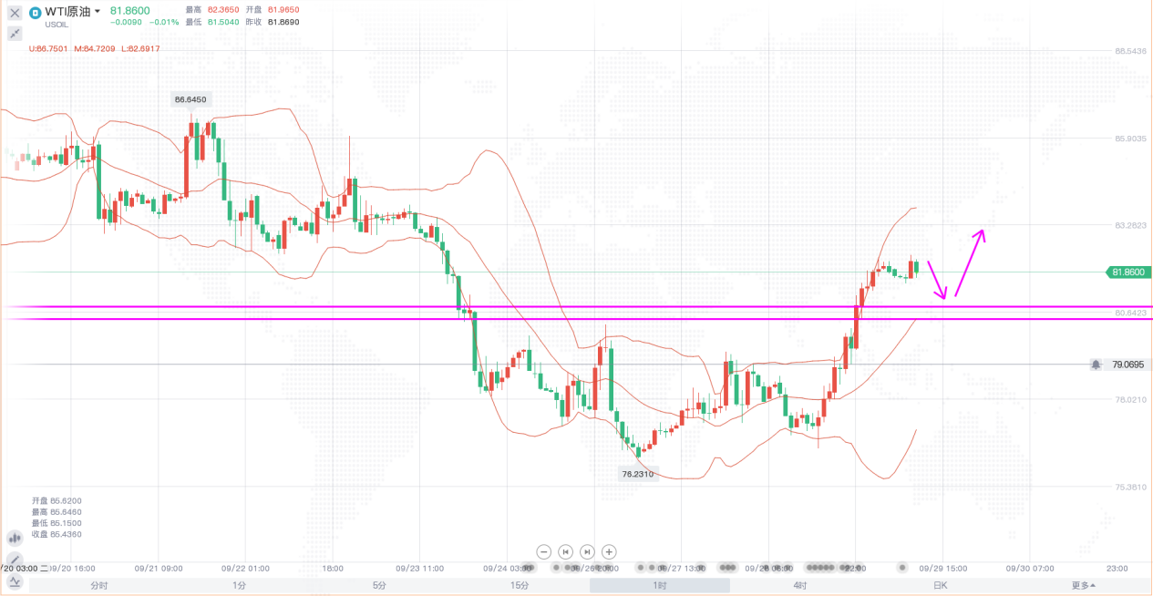原油价格周二周三连续两天上涨,价格在76.2附近逐渐有企稳的迹象,但目前还未到抄底的时间。日线级别,布林带收口,价格在下轨附近受到支撑反弹,并在昨日一举站上80美元关口上方,这也给多头带来了一定的希望,但目前关键阻力位置尚未突破,也就是布林中轨附近的阻力。4小时,布林带开口向上,价格突破上轨附近阻力,短线走势震荡偏多,日内预期价格小幅回调后会再度走高,操作思路上回调做多即可,下方关注80.4-80.8区域支撑。