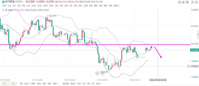 原油价格整体走势还是以空头为主,价格虽然走出了几波反弹的行情,但未能打破下跌走势,大的方向暂时尚未扭转。日线级别,布林带开口向下,价格运行于中轨和下轨之间,早间开盘价格跳空高开,存在一定的反弹机会,但价格在未站上布林中轨之前,多头还需慎重。4小时,布林带收口,价格暂时在中轨附近收到支撑,上方83美元附近阻力强劲,短线上破有一定难度,日内操作思路上以反弹高空为主。