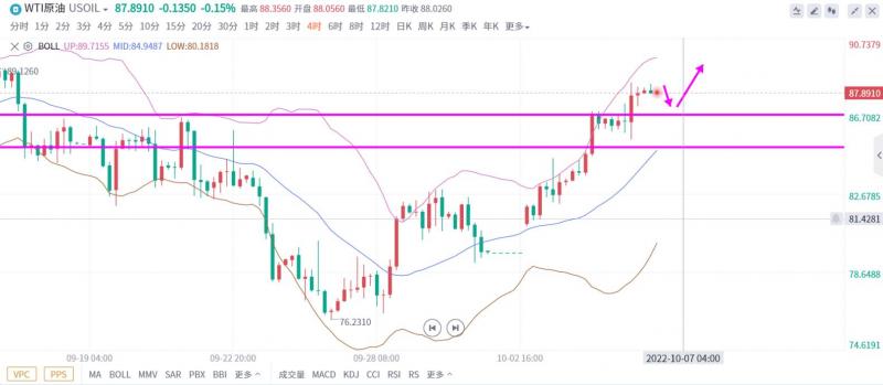 原油价格本周连续三天持续反弹,价格在突破日线布林中轨后,基本没有太多的反弹,短线价格走势比较强势,有挑战90美元关口的可能。日线级别,布林带走平,价格形成三连阳走势,预期日内价格会延续上涨走势,下一个目标就是上轨附近90美元附近阻力。4小时,布林带开口向上,价格呈阶梯式上涨,而每次上涨之后的回撤横盘就是多单最好的进场点位,日内需关注86.8-87区域支撑,操作思路上回调做多为主。