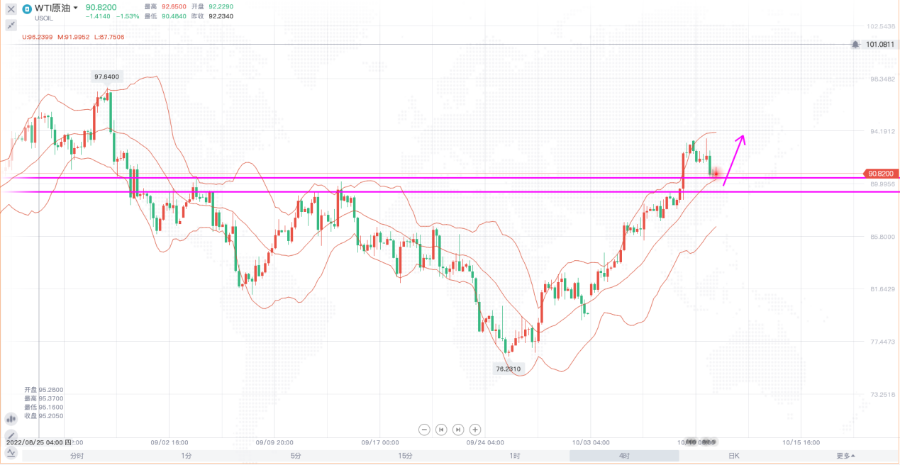 技术面上来看,原油日线布林带开口,价格在触及到上轨后回落,短线存在一点的回落需求,但下方90美元关口支撑强劲,整个油价依旧维持在上行通道之中,价格回踩之后更多的可能是维持震荡走势。4小时,布林带开口向上,价格受到中轨支撑,一路震荡上行,日内需关注下方89.5-90区域顶底转换位置的支撑,也就是布林中轨所在之处,只要没下破,短线就有再度反弹的机会,日内操作思路上暂时先看一波反弹,以89.5一线支撑为防守,回调做多即可。