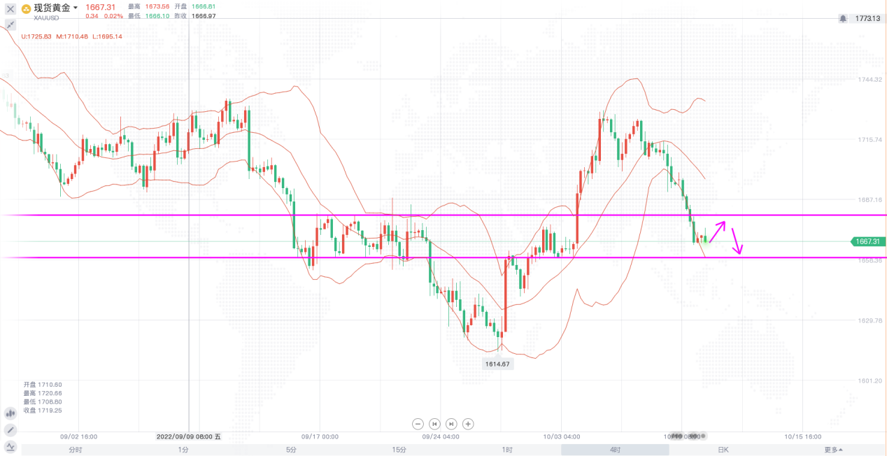 在美联储内部有一个强烈的共识,即在明年3月之前将目标政策利率提高到4.5%左右,并在美联储评估对通胀的影响并给供应链提供恢复时间之际,将利率保持在那种水平。短期美元指数可能突破115关口,就业数据强劲到足以让美联储连续第四次加息75个基点几乎成为板上钉钉,美元指数依旧维持多头形态。不过,俄乌地缘局势依然紧张,世行行长和IMF主席警告全球经济衰退风险上升,仍有一些避险买盘支撑金价,在价格失守1660关口前,多头仍有一定的机会,但还需回升至1690关键位置上方,才能增加短线看涨信号。