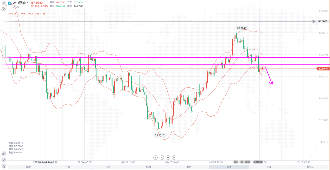 原油本周持续走回落行情,价格在打破之前震荡上行格局之后,基本没有太多的反弹。日线级别,布林带走平,价格走车三连阴走势,这波的回撤极有可能去回踩中轨附近的支撑,也就是84.5一线,短线下行风险较大。4小时,布林带开口向下,价格呈震荡下行走势,两次反弹未能突破中轨附近阻力,预期日内小幅反弹后延续下跌走势,短线关注上方88-88.5区域阻力,操作上继续保持反弹高空思路。