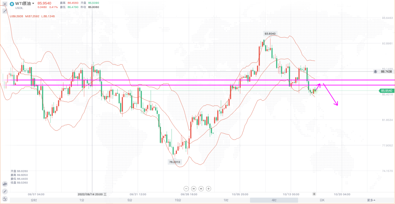 原油价格上周重回跌势,价格自高点回撤至85.2美元附近,日线级别,价格也算是回踩至中轨支撑附近,短线价格存在一定的反弹机会,但就整个走势而言,反弹力度不会太大,更多的可能是走震荡,日内需关注下方布林中轨的支撑,也就是85美元,价格一旦下破,下方空间就大了。4小时,布林带开口向下,价格呈震荡下行走势,短线需关注上方87-87.5区域阻力,价格小幅反弹之后或将延续下行走势,日内操作思路上以反弹高空为主。
