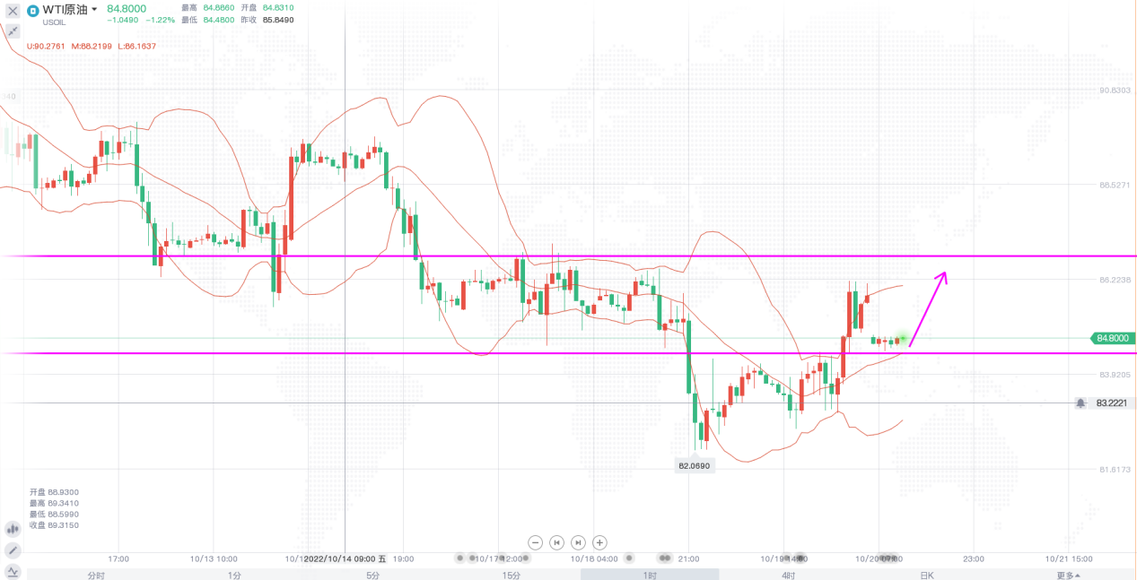 原油价格周三小幅反弹,收复了周二的跌幅,日线级别,布林带走平,价格在中轨附近徘徊,形成了小范围内的震荡走势,价格自本周以来,整体波动并不是很大,更多的是以震荡走势为主,而基本面带来的影响给予了油价一定的反弹机会,短线价格有重新站上布林中轨的可能。4小时,布林带开口向下,价格试探80美元后迎来反弹,短线走势震荡偏多,短线需关注下方84.1-84.4区域支撑,预期价格小幅回踩之后会延续反弹走势,日内操作思路上回调做多即可。