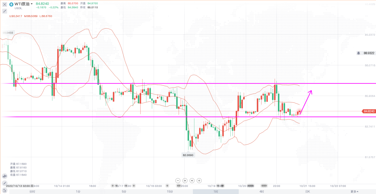 原油本周以来整体呈现出震荡走势,日线级别,价格围绕着布林中轨附近横盘震荡,基本面利多利空因素交错,短线走势并不是很明朗,昨日基本按照预期小幅反弹,但美盘时段又回吐了涨幅,守在了84美元上方,日内价格有继续反弹的机会,但预期和昨天一样,反弹的空间并不是很大。4小时,布林带走平,价格依托布林中轨支撑横盘,短线存在一定反弹机会,日内继续关注下方84附近支撑,操作上以回调做多为主。