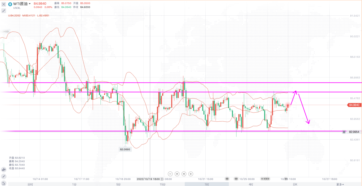 原油价格本周波动不大,价格始终维持在83-86美元区间之内震荡,整体走势没有一个明确的方向。日线级别,布林带收口,价格横盘于布林中轨下方,虽然中途多少向上试探,均未能站上中轨,短线价格或将继续保持低位震荡走势。4小时,布林带收口走平,整体走势变化不大,在价格未突破震荡区间之间,保持震荡思路高抛低吸,破位了再去跟随。