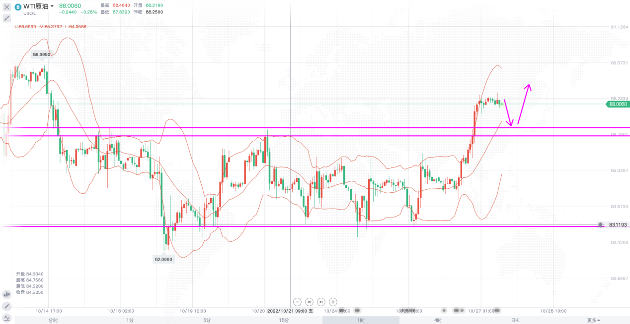 原油价格昨日打破了本周以来的震荡区间,价格持续走高,日线级别,布林带走平,价格一举突破了布林中轨一线阻力,形成了区间破位,价格站上了88美元,短线走势偏多头,而下一个目标就是90美元关口。4小时,布林带开口向上,价格自中轨附近连续阳线上涨,并一度突破上轨附近阻力,那么形成破位之后的操作就简单了,回踩确认做多即可,基于基本面的影响,短线价格大概率会试探90美元,日内需关注下方86.7-87区域支撑。