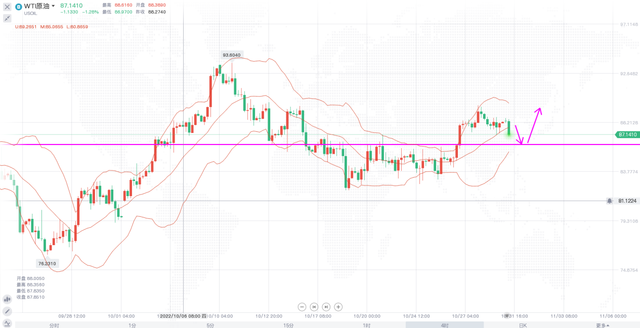 原油价格上周经历震荡之后迎来了一波上涨,日线级别,布林带收口,价格经过多次盘整,终究站上了中轨一线,短线价格走势整体偏多,不过需关注日内价格的回撤力度,只要价格没跌回前期震荡区间,就还有反攻的机会。4小时,布林带收口,早间开盘价格小幅回调,价格暂时跌破中轨一线支撑,有回踩震荡区间上限的可能,不过大的方向并未改变,日内操作上继续保持回调做多的思路,下方关注86.2-86.5一线支撑。