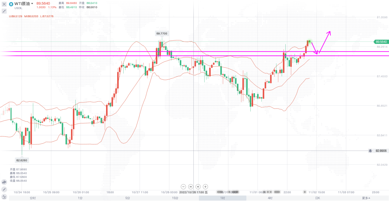 原油:回调88.7-89区域做多,止损88,目标90.4-90.8。
