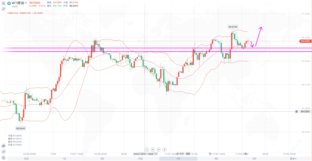 原油价格周三延续上涨,日线级别,布林带走平,价格依托布林中轨的支撑继续反弹,短线价格反弹走势已经很明朗,只要价格能够站稳90美元上方,就有进一步走高的机会。4小时,布林带开口向上,价格回踩中轨后拉升,短线呈阶梯式上涨走势,随时有走出新高的可能,日内操作上继续以回调做多思路为主,下方关注88.7-89一线支撑。