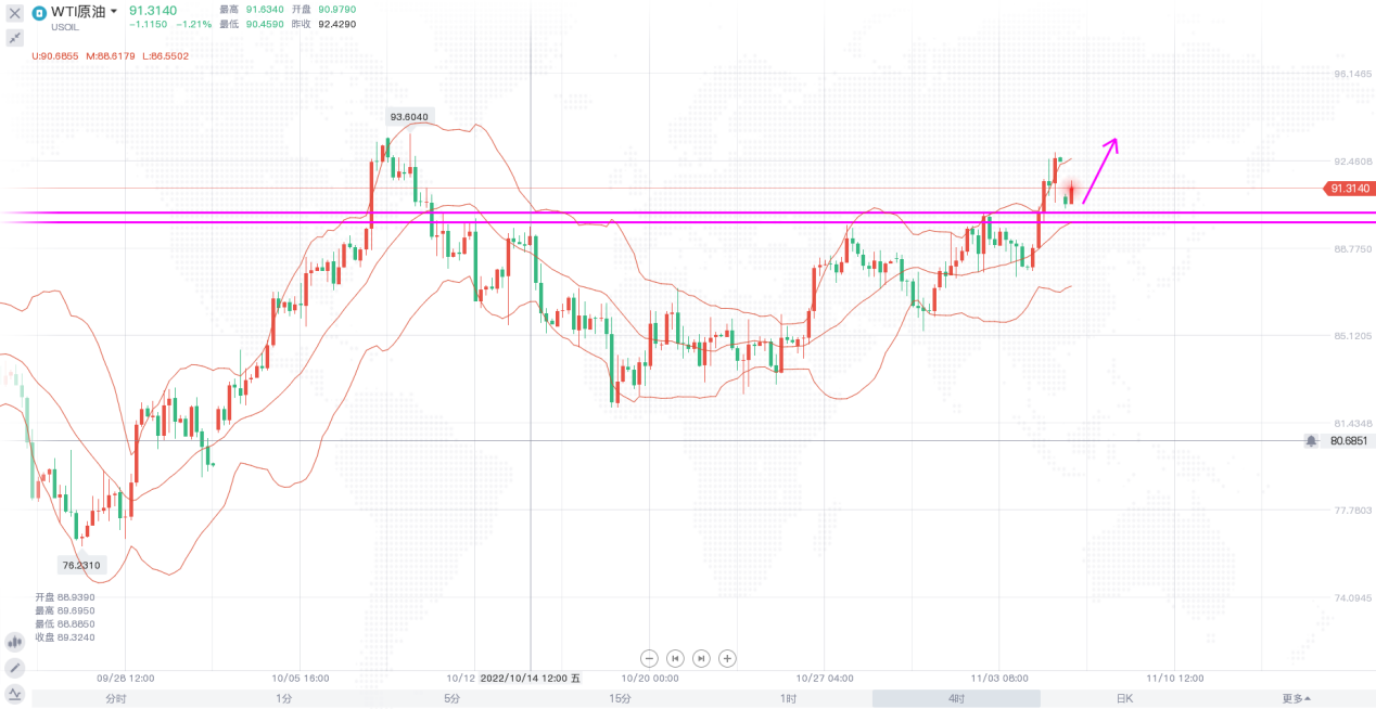 原油价格近期的强势已经毋庸置疑,日线级别,布林带走平,自价格站上布林中轨之后持续震荡上行,上周五的上涨使得价格再度站上了90美元,虽然早间价格跳空低开,但整体方向不受影响,短线走势还是以震荡偏多为主。4小时,布林带开口向上,价格回踩确认中轨支撑后拉升,并形成向上的破位,日内短线操作思路以早间跳空低点为支撑,继续看多,上方关注92.5一线阻力。