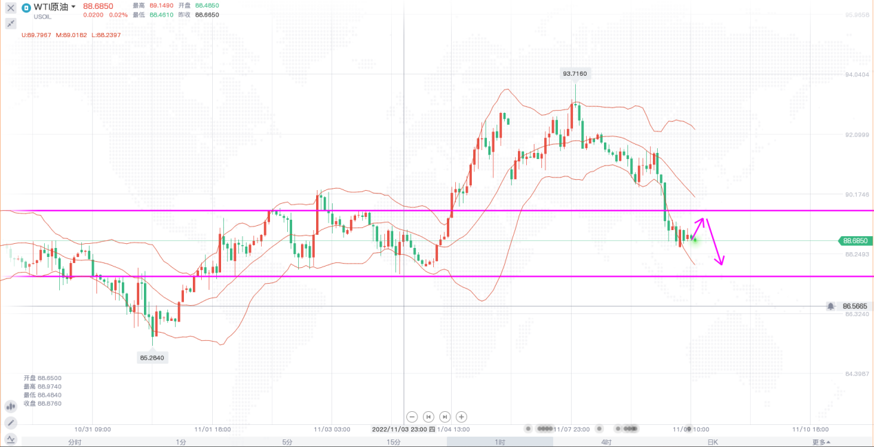 原油价格周二在开盘之后一路保持震荡下行的态势,整个跌势中反弹力度较弱,最终以阴线收盘,回吐了本周的大部分涨幅。日线级别,布林带走平,整个价格运行于布林上轨和中轨之前,价格在反弹至10月高点附近后遇阻回撤,日内开盘价格延续下跌走势,并有回踩布林中轨的趋势,短线走势以宽幅震荡行情为主。4小时,布林带收口,价格回撤跌破布林中轨一线支撑,短线有延续下跌的走势,日内需关注上方89.5一线阻力,操作上以反弹高空为主。
