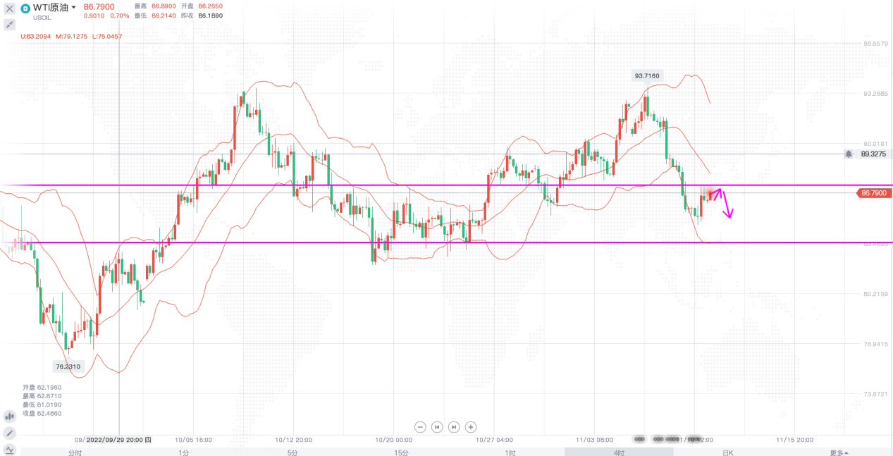 原油价格日线级别来看,布林带收口走平,本周价格连续下跌,使得价格重回布林中轨下方,昨日的小幅反弹也是在中轨附近遇阻回落,短线想要有所反弹,首先就得先站上中轨这一阻力,也就是87美元一线,而日内的关注点也在于此,只要价格没上破,那就还存在回撤的风险。4小时,布林带开口向下,价格沿着下轨震荡下行,虽然价格暂时企稳,但这个短线走势震荡偏空,日内预期价格小幅反弹后延续下跌走势,操作上尽量以反弹高空为主,上方关注87美元一线阻力的压制。