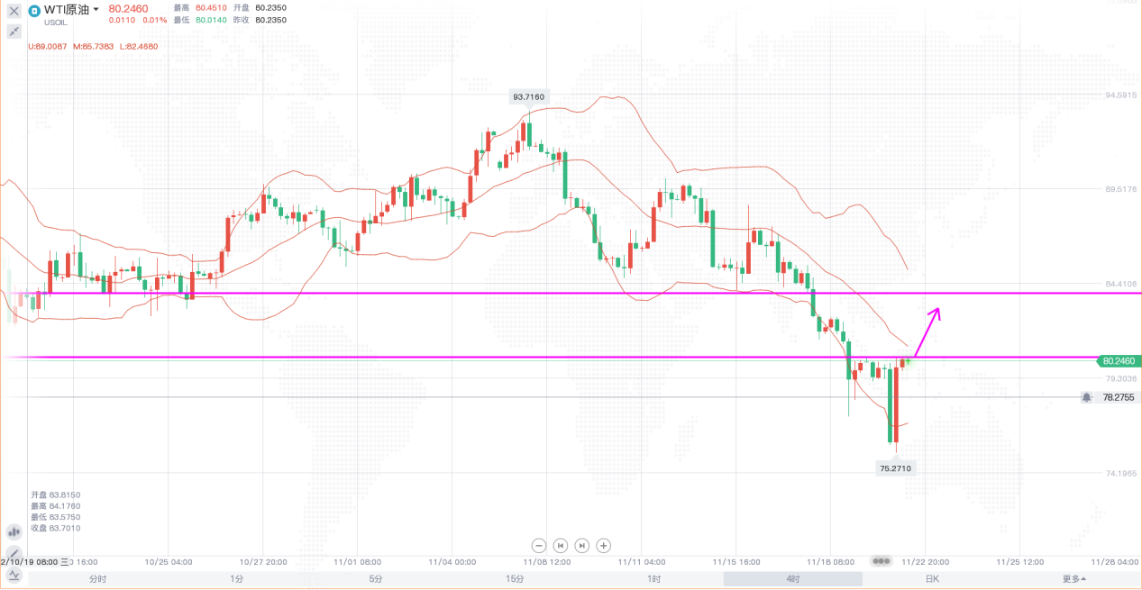 原油价格日线级别布林带开口,不过昨日的探底回升使得价格在下轨附近收下影线较长的十字星,短线价格下方支撑较强,日内价格一旦站上80.4美元一线,可能会迎来一波反弹去试探82-82.5美元一线。4小时,布林带收口,价格走低后快速拉升,在80.4美元下方横盘震荡,随时有上破的可能,日内关注的重点就是80.4美元一线的得失情况,在没有上破之前,先行观望,等价格站上此位置之后再去跟随也不迟。
