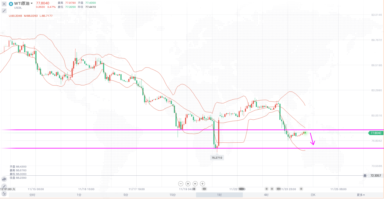原油价格日线级别布林带开口,昨日的下跌使得价格再度回到低点附近,价格短线刺穿了下轨一线支撑,形成了向下的突破,考虑到近期基本面利空因素的影响,短线价格将很难走出像样的反弹,更多的可能是在低位持续震荡。4小时,布林带开口向下,连续阴线跌破中轨支撑,价格临近低点位置,下方支撑强劲,即便是反弹也会有一波下探回踩的过程,短线价格大概率会去回踩76一线支撑,日内操作思路上暂时先以反弹高空为主,下方关注76一线支撑。