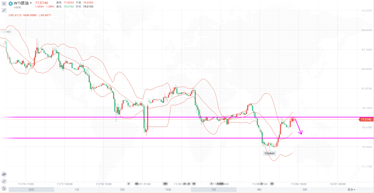 原油价格近期在整体走势还是比较弱,价格在月初冲高之后,持续走回落,整个走势以震荡偏空为主。日线级别,布林带持续开口向下,价格在昨日快速下探,走出了一波新的低点后,暂时在下轨附近企稳,但整个反弹力度不是很大。4小时,布林带开口向下,价格探底回升目前在中轨遇阻,整个走势受到下行通道压制,也就是77.7-78区域阻力,在没有向上形成破位之前,日内操作思路上继续以高空为主。
