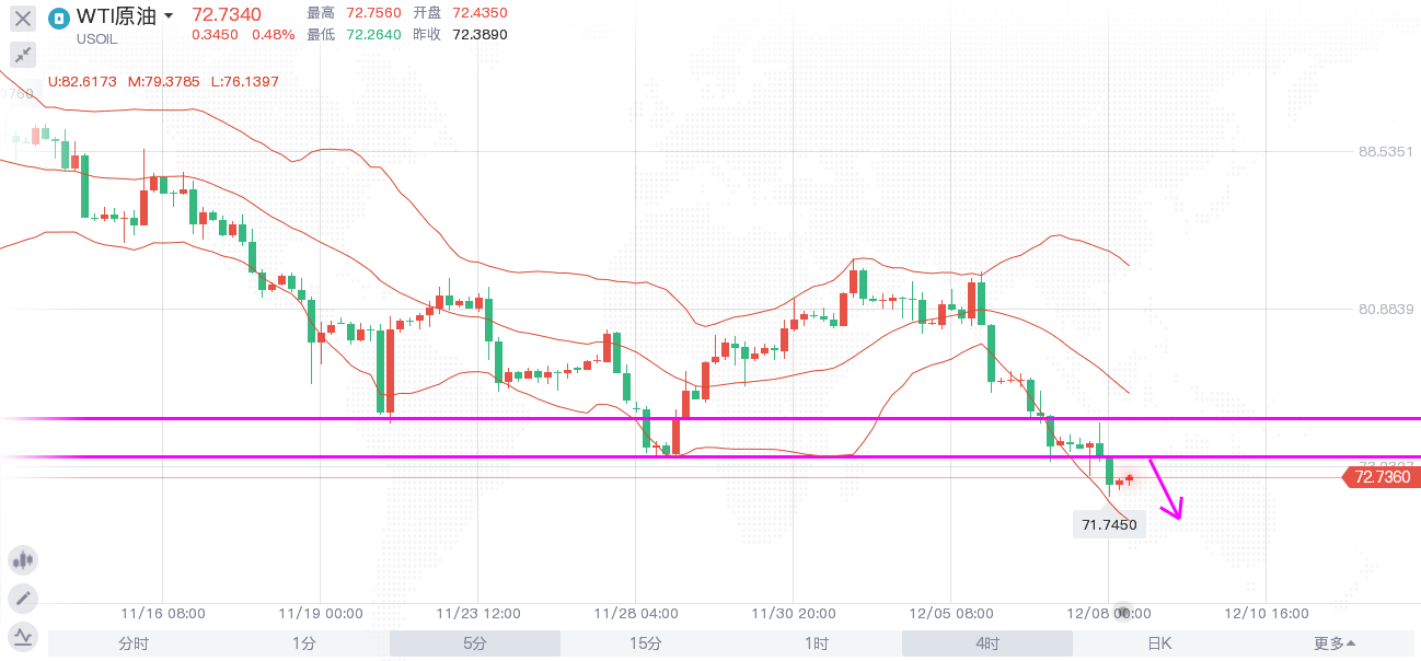 原油价格近期的连续下跌奠定了弱势的格局,整个下跌过程没有太多的反弹,并不断的走出新的低点。日线级别,布林带持续开口向下,四连阴格局使得价格有了试探70美元关口的可能性,短线走势方向比较明朗,而日内需要关注的就是下方70美元关口的支撑能否守住。4小时,布林带开口向下,价格呈阶梯式下行,昨日美盘时段,价格在横盘之后向下突破了11月底的低点位置,也就是73.5美元一线,日内需关注这一线的阻力,预期价格小幅反弹后延续下跌走势,操作思路上继续以反弹高空为主。